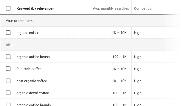 With Google Keyword Planner you can get insight into all relevant information about the keyword. For example, let’s say that you run a coffee-business and you are writing coffee-related blog posts on your website.