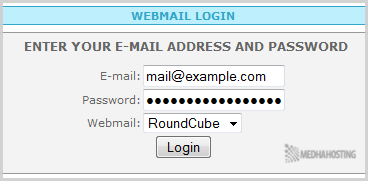 4. You will be redirected to a SiteWorx Webmail page. Enter your full e-mail address/password, choose “RoundCube“, “Horde” or the “SquirrelMail” Webmail program in the “Webmail” field and then click on the login button.