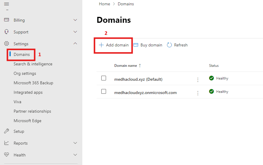 - Sign in to the Microsoft 365 admin center and navigate to Settings > Domains.
