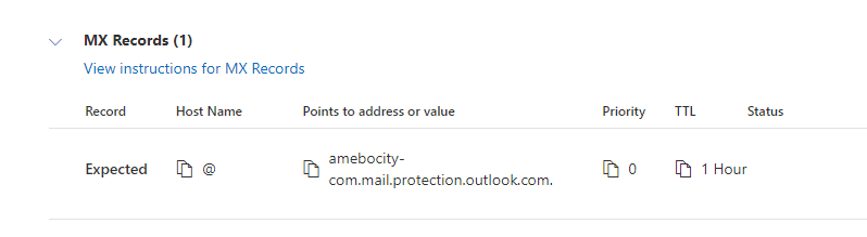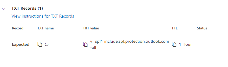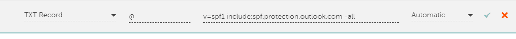 - TXT Value: v=spf1 include:spf.protection.outlook.com -all