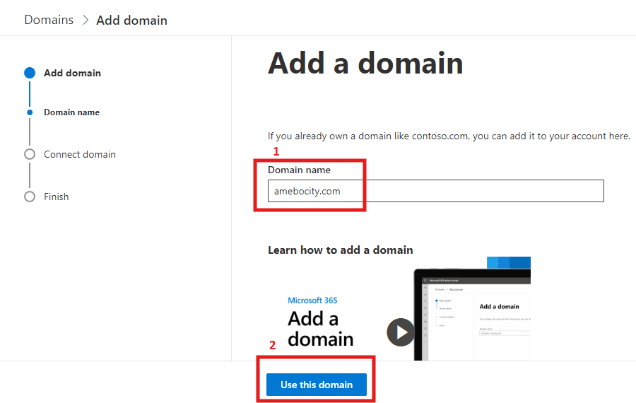 - Type the name of the domain you want to add to the M365 tenant and click the 'Use this domain' button.