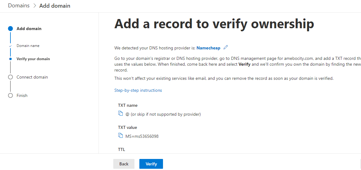 - Save the record, go back to the Microsoft 365 admin center, and click Verify. Verification may take up to 15 minutes, so be patient if it doesn’t work right away.