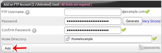 Password: Enter new FTP password in the password field and the confirm password field or generate a new password by clicking on the “Generate” button.