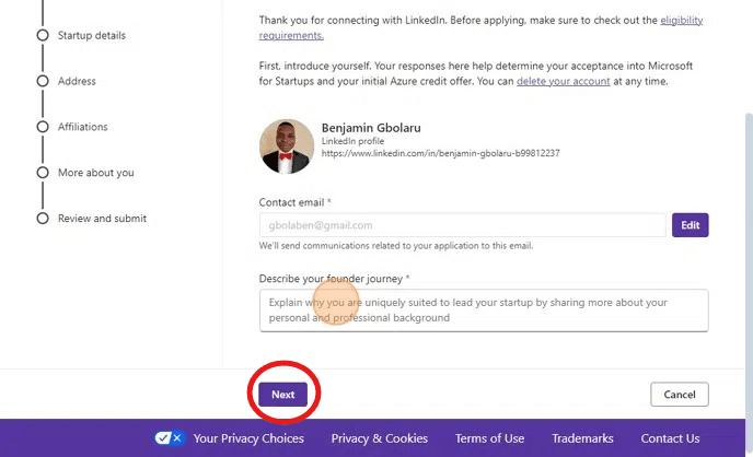 5. Describe your founder journey and then click 'Next'.