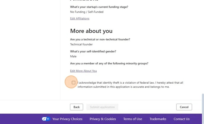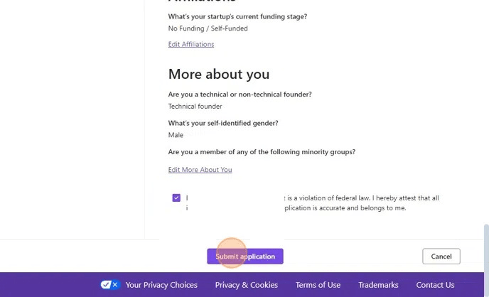 - Submit your application with details about your startup.