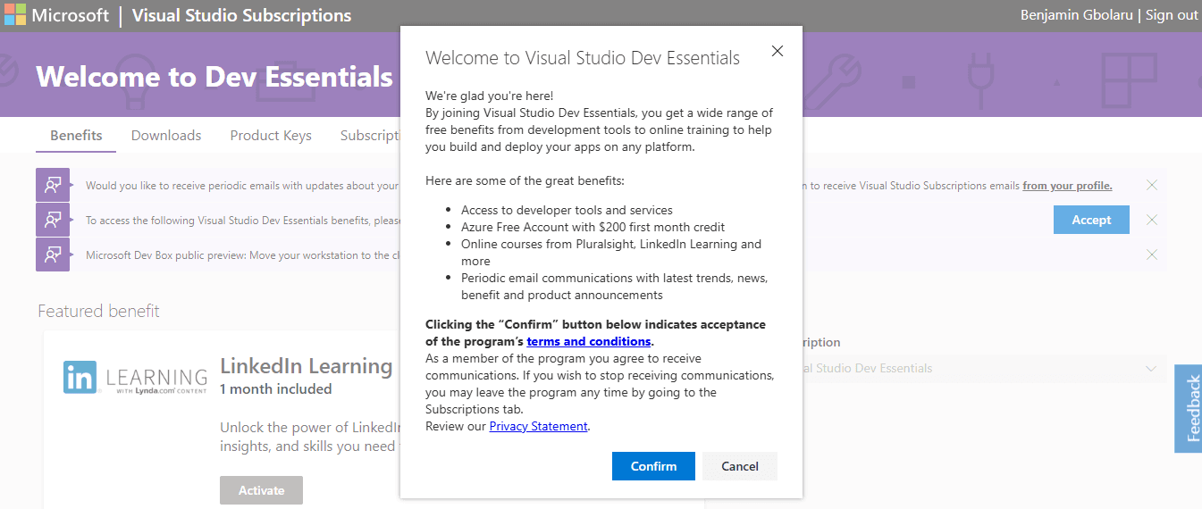 3. Click "Confirm" on the popup welcoming you to Azure benefits for Visual Studio.