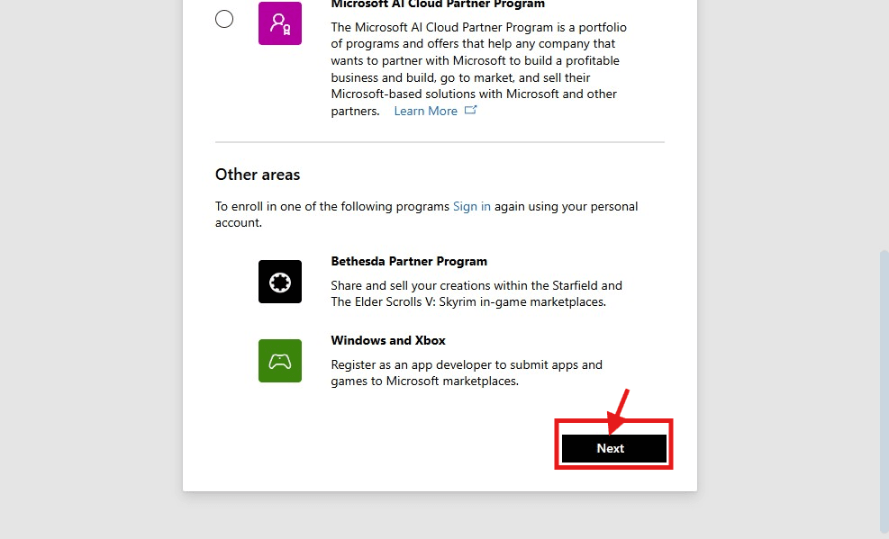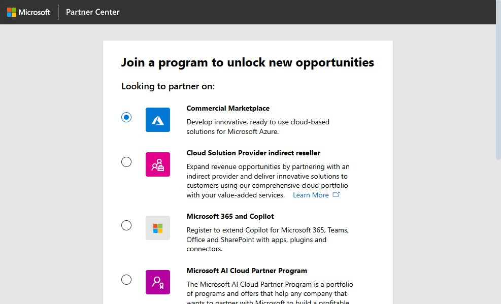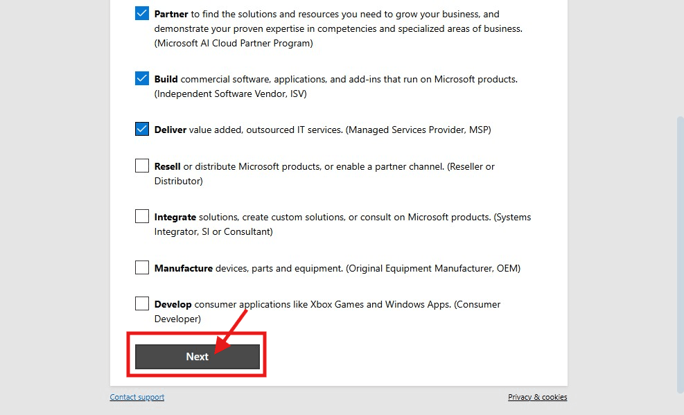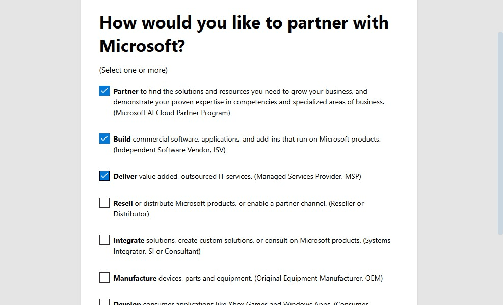 4. Select how you would like to partner with Microsoft and click Next.