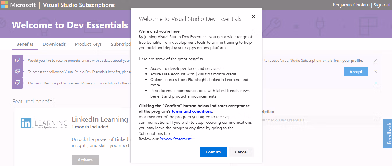 3. Click “Confirm” on the popup welcoming you to Azure benefits for Visual Studio.