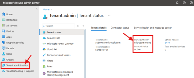 - Go to the Tenant Administration > Tenant Enrollment > MDM Authority.