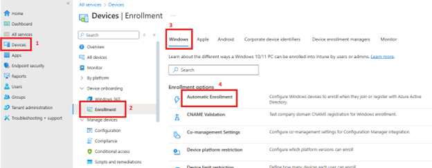 - Navigate to Devices, go to Windows, then click on Windows enrollment.