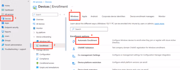 Intune provides self-service, automatic, and bulk enrollment techniques to simplify onboarding various device types.