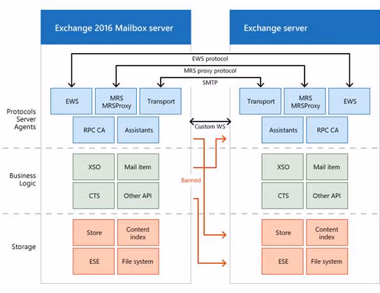 Protocol layer communication between Exchange servers, illustrating the “every server is an island” architecture