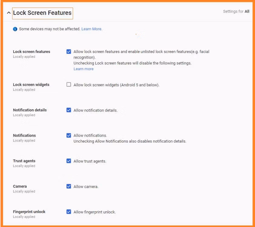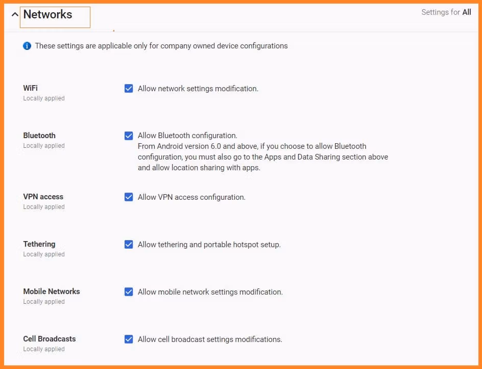 These settings are applicable for both Work Profile and company owned device configurations unless explicitly specified.