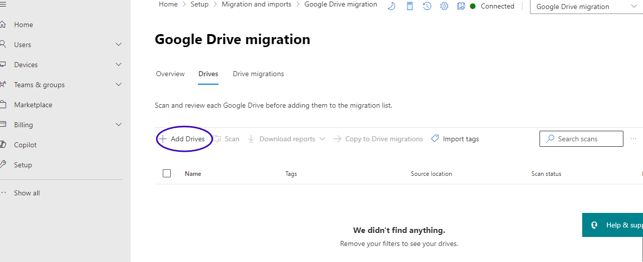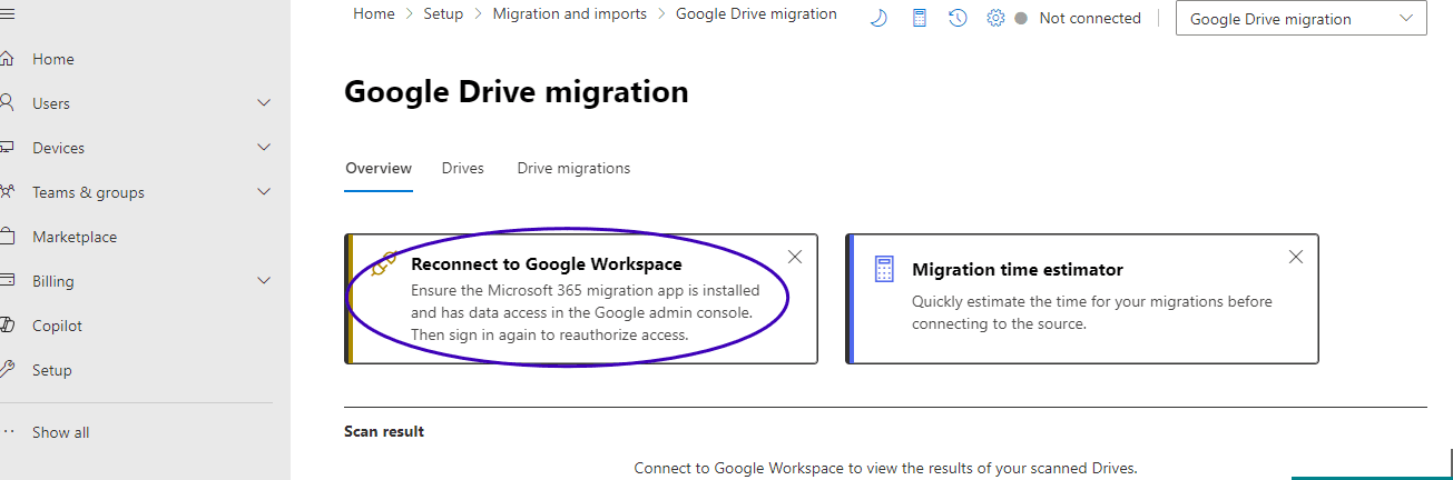 After clicking Get Started, I was redirected to the Google Drive Migration page. From there, I clicked on Connect to Google Workspace to establish the connection.