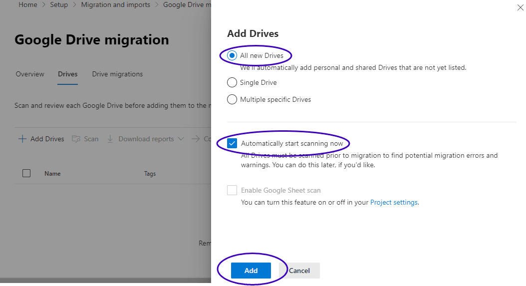 At the Google Drive Migration page, I clicked Add Drive and selected All New Drive. I then checked the box next to 'Automatically start scanning now' and clicked the Add button.