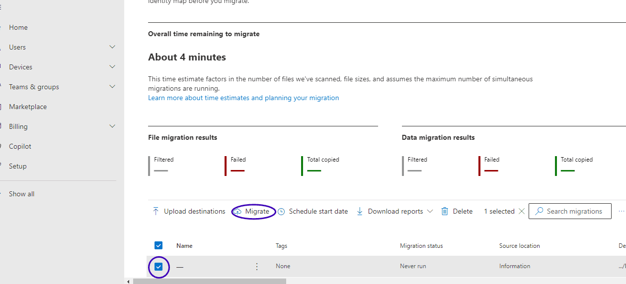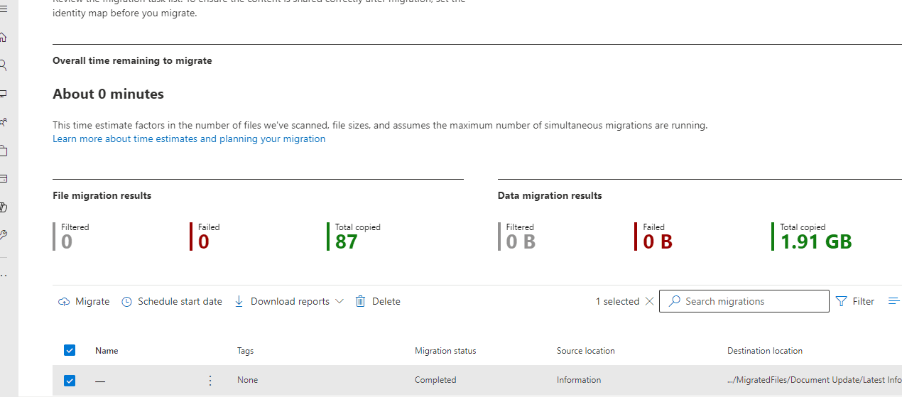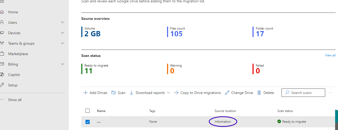 Following the successful scan, all files in the Google Workspace account were ready for migration. To initiate the migration process in batches, I started with the shared drive named 'Information'. As shown in the screenshot below, this shared drive is now prepared for migration to the designated SharePoint site.