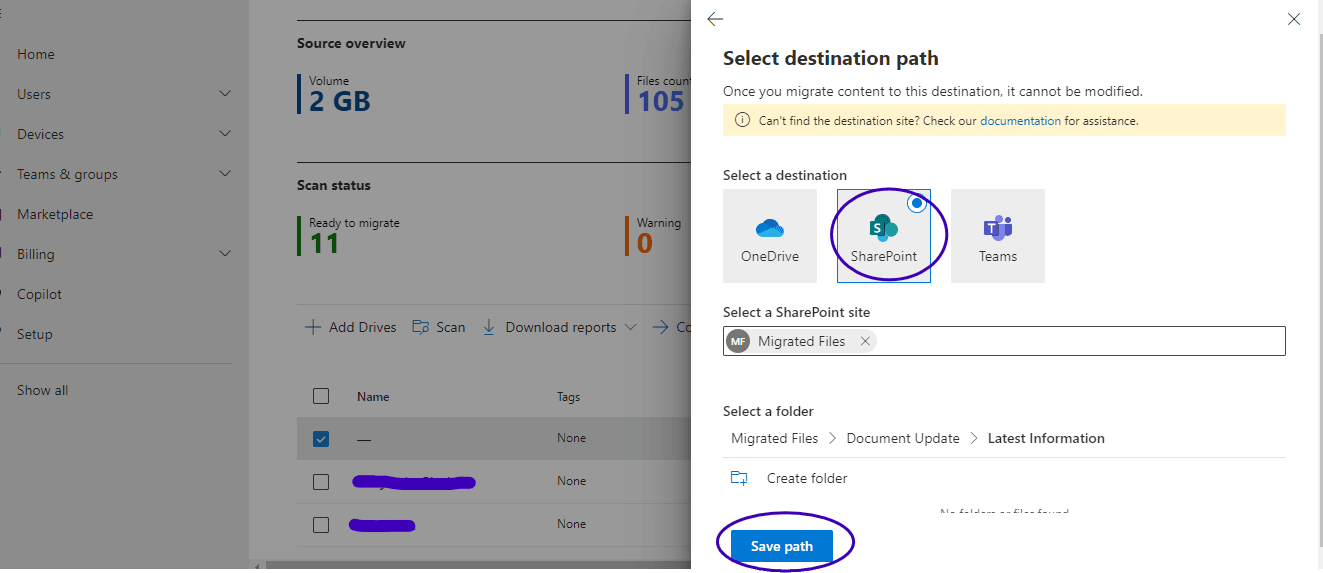 Next, I initiated the migration by clicking “Copy to Drive Migration” and selected SharePoint as the destination path. I then chose the previously created site and specified the target folder within the site's Document Library. I Then click the “Save Path Button”.