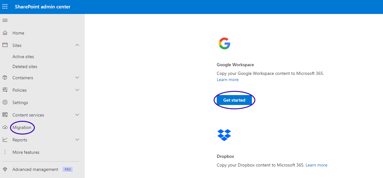 I signed in to the M365 Admin Center, navigated to SharePoint, and clicked on it to access the SharePoint Admin Center. From there, I clicked on Migration, which redirected me to the Migration Manager. Next, I selected Google Workspace by clicking the Get Started button.
