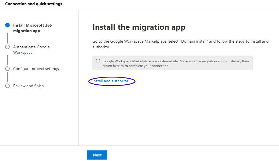 Next, I installed the migration app by clicking Install and Authorize, granting the necessary permissions for the migration process.