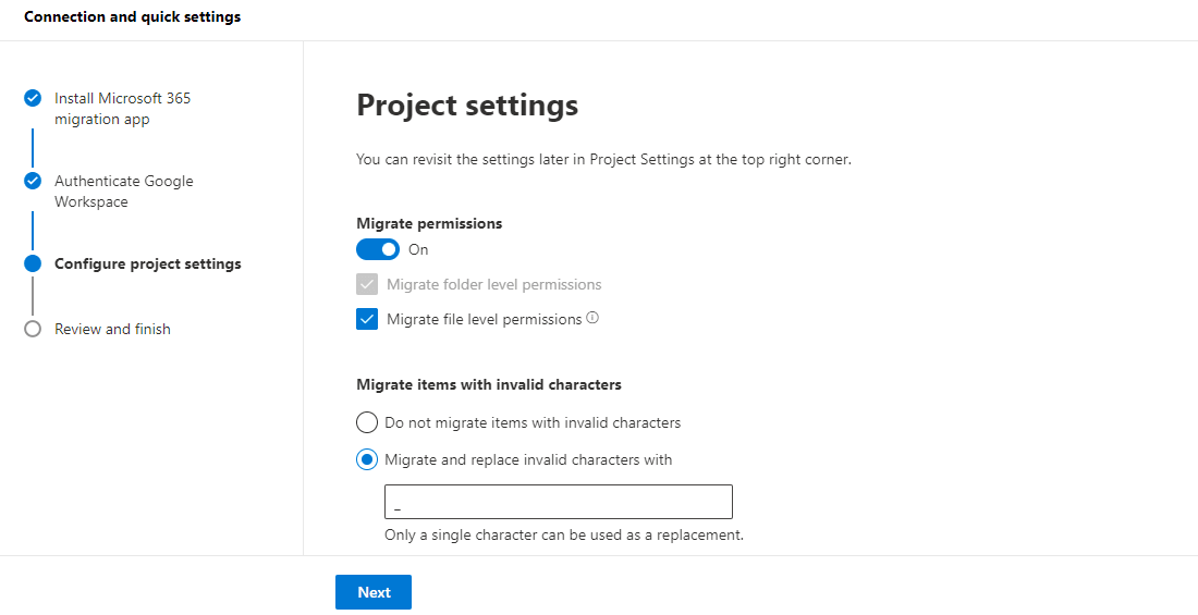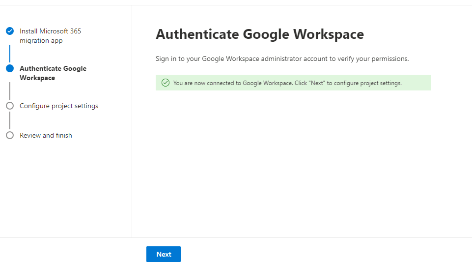 After authenticating Google Workspace, I configured the project settings and clicked Next to proceed.