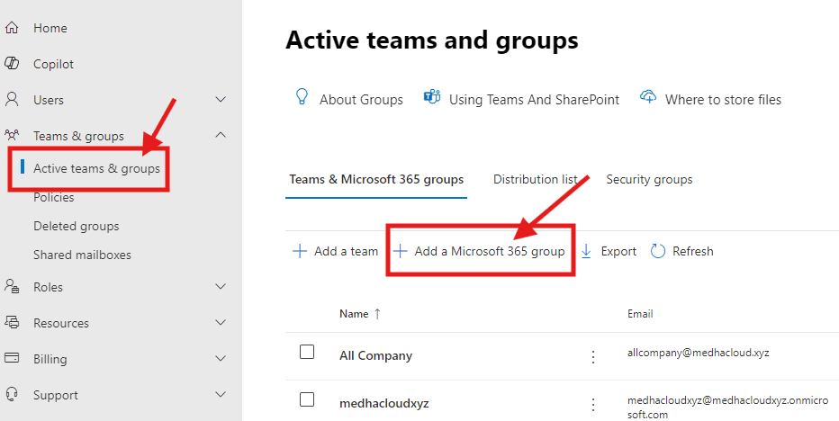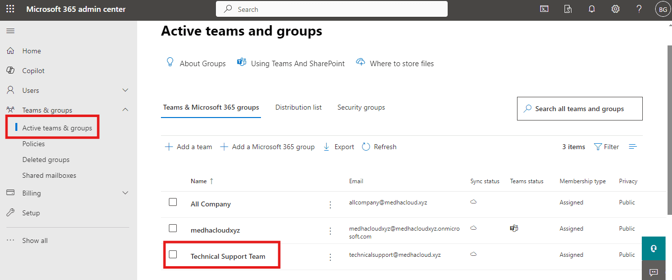 In the Microsoft 365 admin center, expand Teams & Groups, then select Active teams & groups.