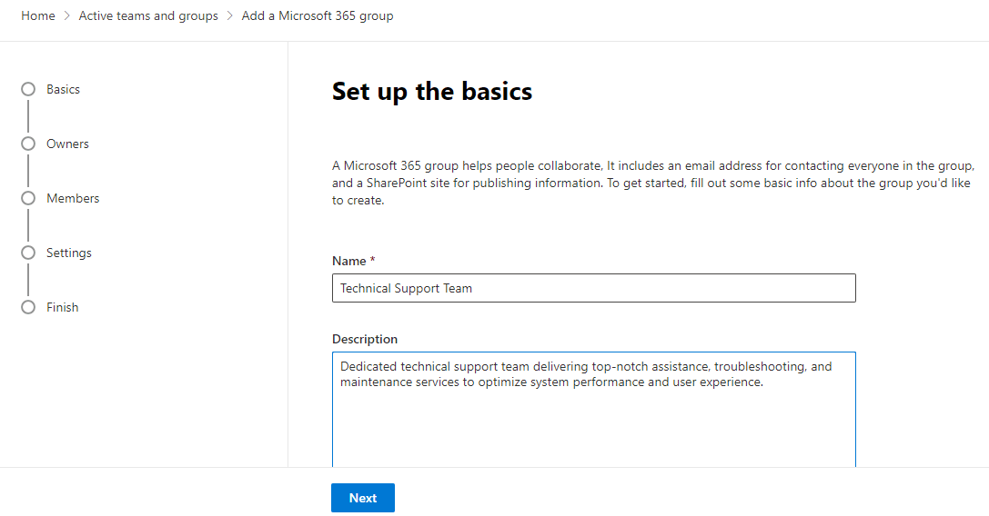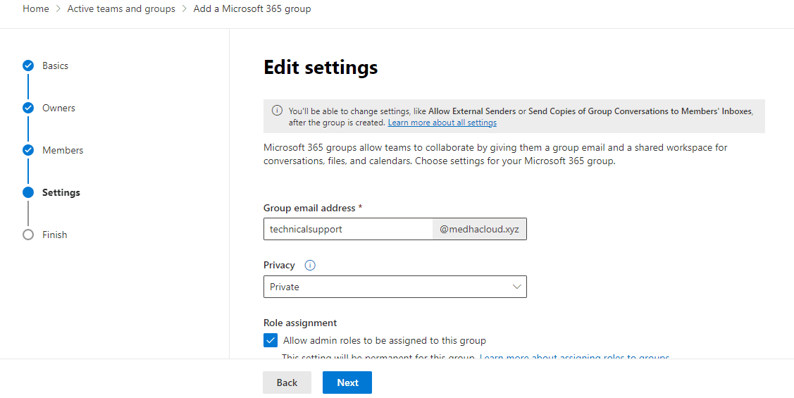 - On the Settings page, set a unique email address for the group, select a privacy option (public or private), and decide whether to integrate Microsoft Teams. Click Next.