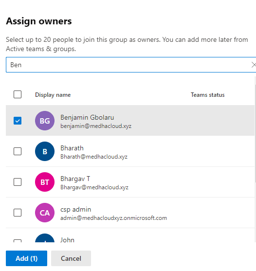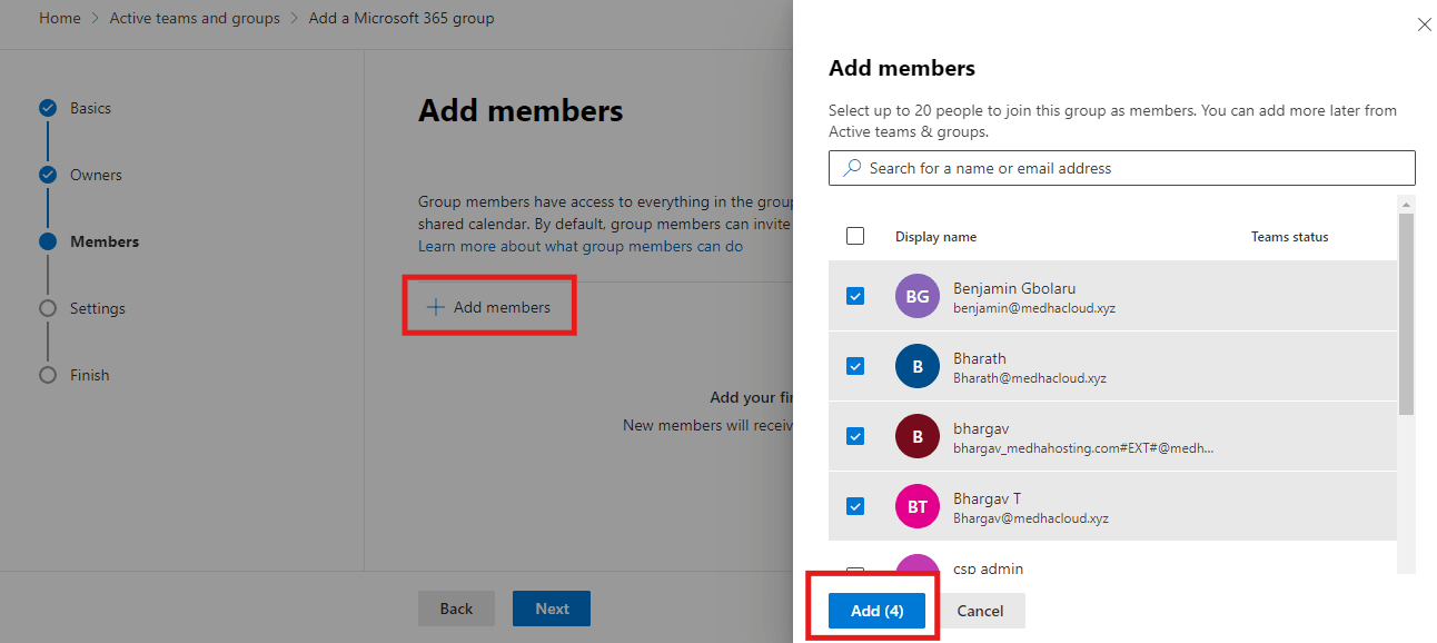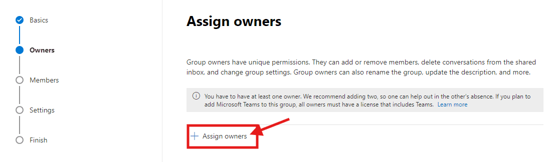 - On the Owners page, select one or more individuals to manage the group. Owners can delete emails from the group inbox, unlike regular members. Click Next.