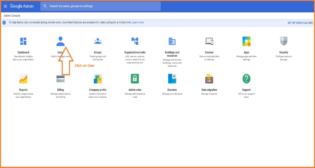 First, you need to go to the Admin console to start the process. Once you reach the dashboard as seen below, click on users.
