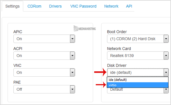 You can change the Disk Driver to Virtio or IDE before installing the operating system but should you change this after installing the OS, it will show an error that the disk is not found or a similar error. Only change this before Installing/Reinstalling the OS.
