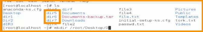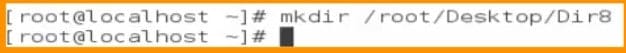 To create a directory in a different location, type the command mkdir, and the path to the location. For example, to create a directory Dir8 in Desktop, the path to the desktop is /root/Desktop. Type mkdir /root/Desktop/ Dir8.