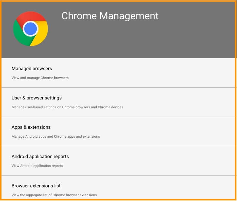 For Chrome management, Go back to devices from Admin console. Click on “Chrome management” that can found on the left
