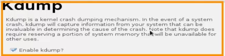 Now you can enable or disable by checking the box below. K dump is kernel crash dumping mechanism. In the event of crash, Kdump will capture information from your system that can be invaluable in determining the cause of crash. It will reserve a portion of system memory that will be unavailable for other users.