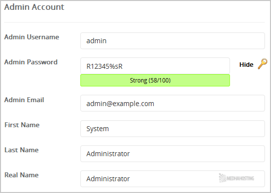 • Admin username: The default username is “Admin” and the edit option is disabled.