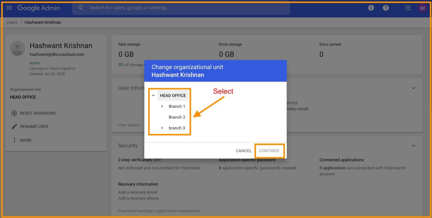 Select the organization that you want the user to be changed and click continue. Refresh the page to see the changes.