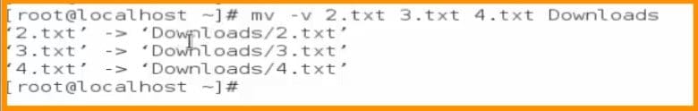 mv –v 2.tct 3.txt 4.txt Downloads and press enter.