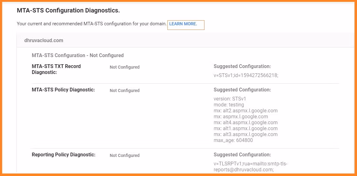 For learning more about MTA-STS configuration click on “LEARN MORE”