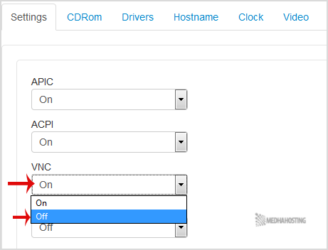 3. Scroll down, under the “settings” tab you can find APIC, ACPI, VNC or PAE. If you want to turn off VNC, then select the “Off” option from the Drop-Down menu under the VNC option. VPS server,