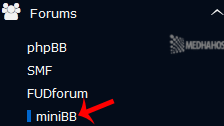 4. On the left side of your screen you should locate the “Forums” category. Click on it and then click on the “miniBB” link that will appear.