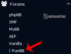 4. On the left side of your screen you should locate the “Forums” category. Click on it and then click on the “PunBB” link that will appear.