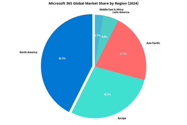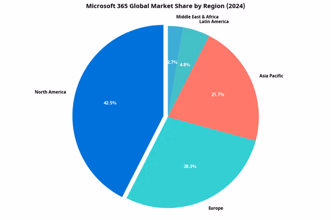 North America’s dominance reflects early enterprise cloud adoption, while rapid growth in Europe and Asia-Pacific underscores Microsoft 365’s global scale and localization success.