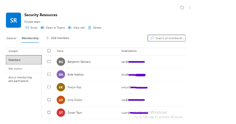 To configure access reviews, you need to create access review policies, specify reviewers, and set frequencies. Using the following scenario, I will demonstrate how to achieve this: An IT Security Manager at a large organization wants to ensure that only active and authorized members of the ‘Security Resources’ group have access to sensitive security resources. To achieve this, the manager decides to conduct a regular Access Review for the ‘Security Resources’ group, which consists of five members: Benjamin, Susan, Evelyn, Bola, and Lola.