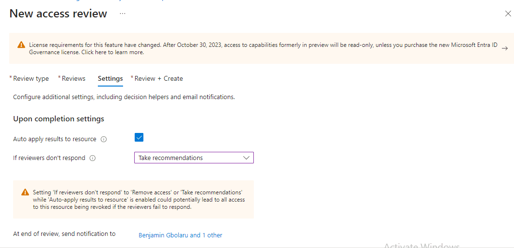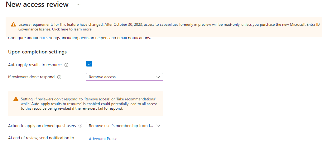 Under ‘Upon completion settings’, I checked the box for ‘Auto apply results to resource’. This means that if any user’s access is denied, their access to the resources will be removed automatically after the review is completed. I also selected ‘Remove Access’ as the action to take if reviewers don’t respond.