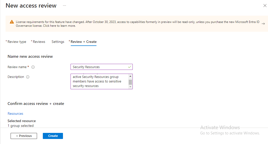 Step 5: Review and Create Policy Under ‘Review + Create’, I named the new Access Review as ‘Security Resources’ and entered a description. Then, I clicked on ‘Create’, initiating the commencement of reviewing users in the Security Resources group membership.
