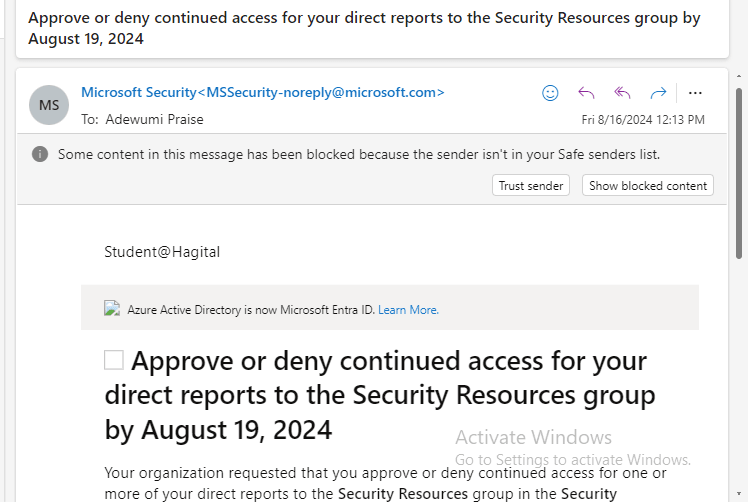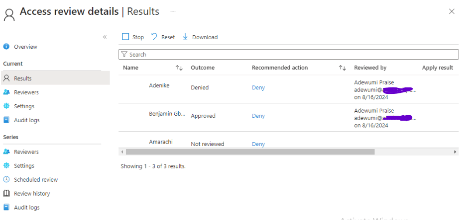 That is exactly what I did, as I used Adewumi Praise’s account, the IT Security Manager, to implement the process. I logged in to his Outlook email account, clicked on the “Start Review” button, and followed the prompts to review and manage access to the Security Resources group.