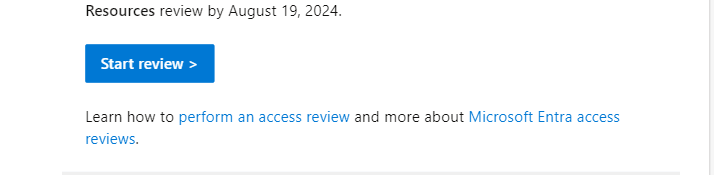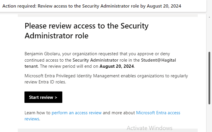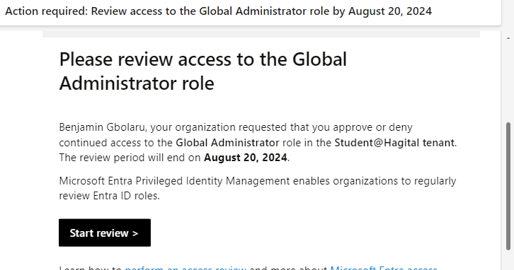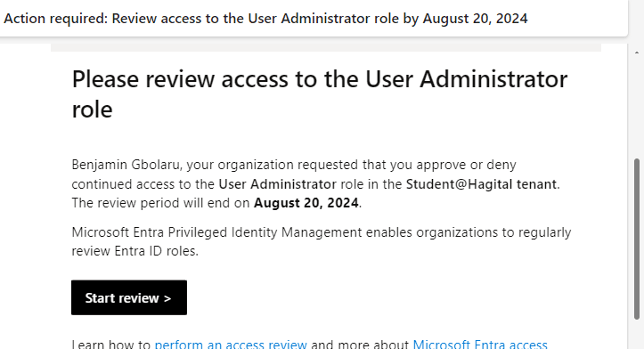 I log in to my Outlook email account and receive an email requesting me to review access to the Security Administrator, User Administrator, and Global Administrator roles. To commence the review, I click on the “Start Review” button.