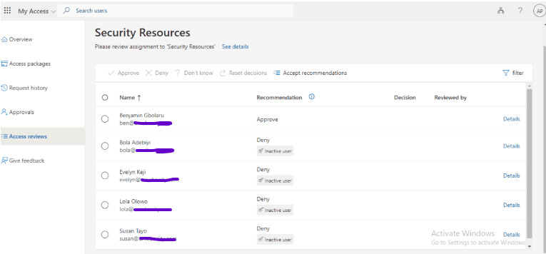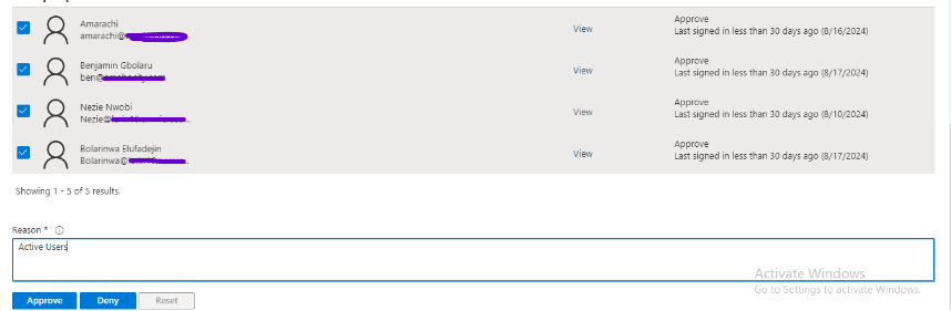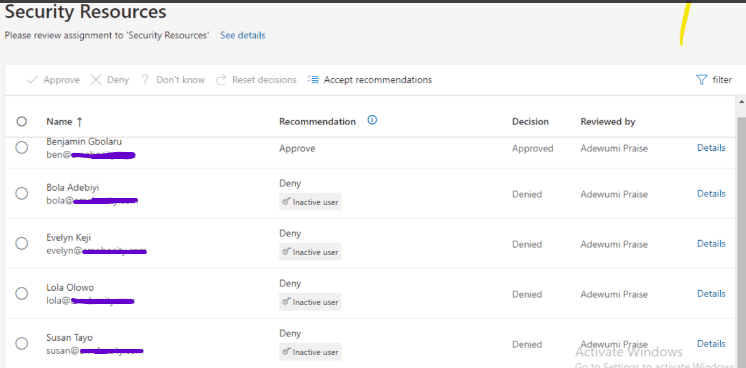 From the screenshot above, notice that only Benjamin Gbolaru is deserving of being approved, while others like Bola, Evelyn, Lola, and Susan are recommended to be denied due to their inactivity. The reason for this may be that they have been transferred to another department within the organization. Therefore, I will follow the recommendation.