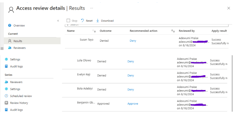 The screenshot below shows the Access Review details and illustrates how all the denied users were automatically removed from the Security Resources Group.
