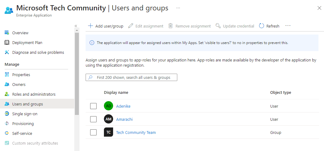 To implement the scenario, I have completed some prerequisites by adding the Tech Community Team’s Group and two users outside of the group, Adenike and Amarachi, to the Microsoft Tech Community Application. I also checked using my account to see if I have access to the newly added app.