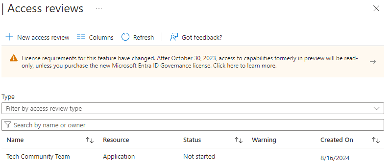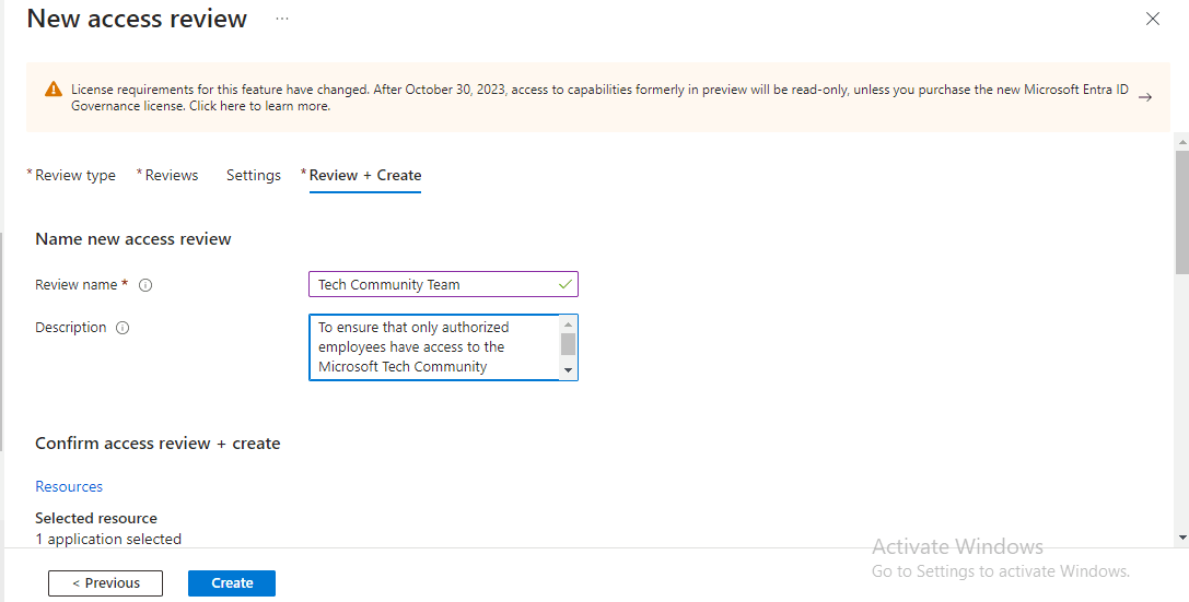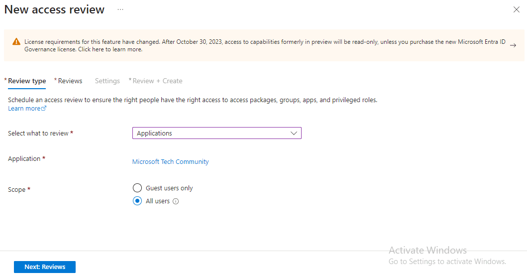 - I log in to the Access Review dashboard, select the Microsoft Tech Community application, and go through the same process for Access Review that I used for Teams and Groups, which will be represented by the following screenshots.