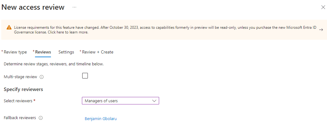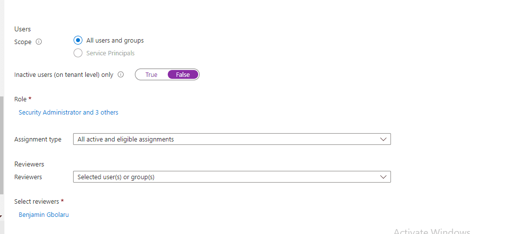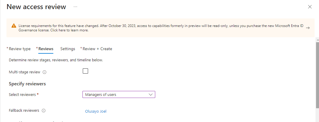 Step 3: Defining Review Settings Under ‘Specify reviewers’, I selected ‘Manager of users’ as the primary reviewer, which is the IT Security Manager. Additionally, I selected Olusayo Joel, the Assistant IT Security Manager, as the fallback reviewer in case the primary manager is unavailable or on leave.